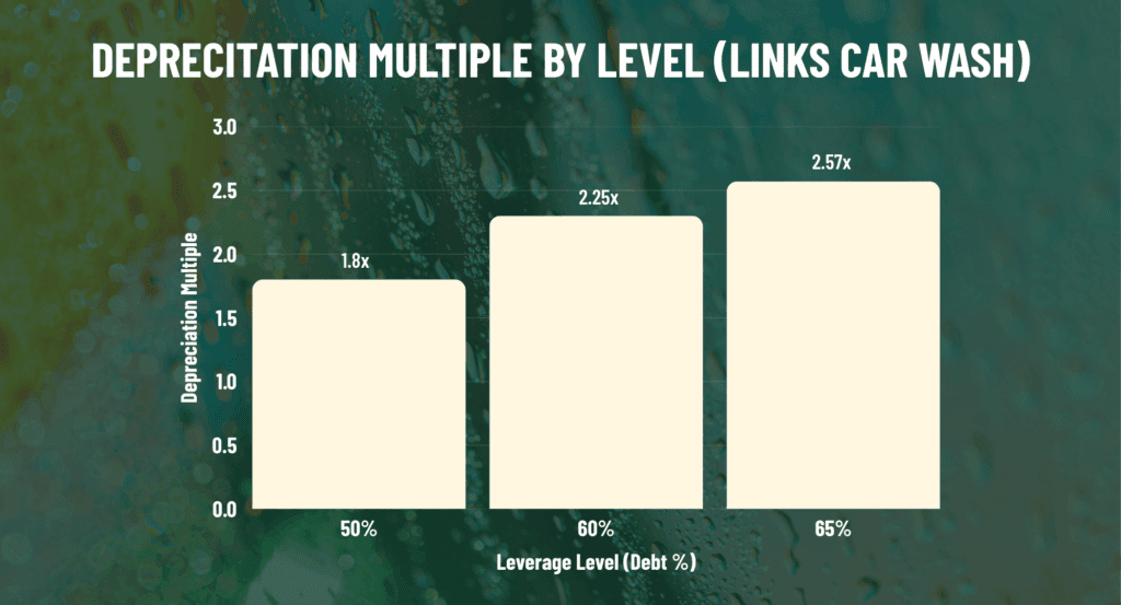 Using leverage—financing purchases with debt—further amplifies this depreciation multiple. When acquiring a car wash, the bonus depreciation deduction applies to the full cost basis of the qualifying assets, regardless of how much is financed with debt. This means investors can deduct the entire eligible amount while only committing a portion of the total cost as equity. For instance, if a $1 million car wash (with $900,000 in depreciable assets) is purchased with 50% debt ($500,000 loan) and 50% equity ($500,000), the $900,000 deduction on $500,000 equity yields a 1.8x multiple. Higher leverage ratios (e.g., 60-70% debt, common in stable cash-flow businesses like car washes) can push this multiple even higher, as the equity denominator decreases while the deduction remains tied to the full asset cost. This strategy not only boosts investor returns through deferred taxes but also supports portfolio growth by freeing up capital for additional investments.